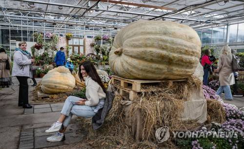 epa09525467 A woman poses near the giant pumpkin weighing 692,5 kilograms during exhibition 'The largest pumpkins grown in Russia in 2021' at the Botanical Garden of Moscow State University in Moscow, Russia 15 October 2021. The exhibition will last until 07 November. At the end of the exhibition pumpkins will be cut and distributed to visitors. EPA/YURI KOCHETKOV