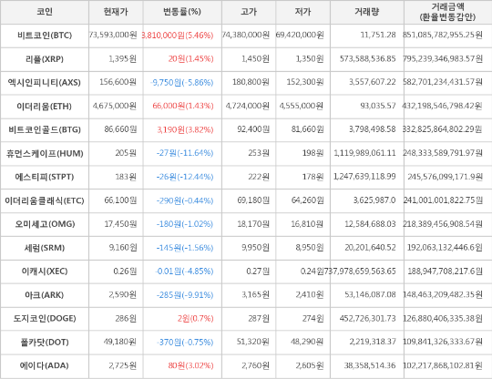 가상화폐 시세 (제공: 암호화폐 거래소 업비트)현재 암호화폐 거래소 "업비트"에 따르면 가상화폐 대장 격인 비트코인의 시세는 전일 대비 3,810,000원(5.46%) 상승한 73,593,000원에 거래되고 있다.