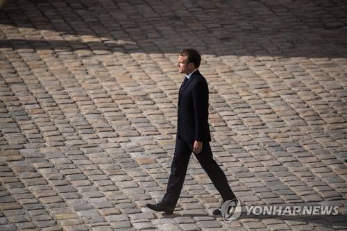epa09525669 French President Emmanuel Macron attends a tribute ceremony for Hubert Germain, a WWII veteran and the last 'Companion of the Liberation', at the National Invalides Hotel in Paris, France, 15 October 2021. Hubert Germain was the last survivor of the 1,038 Companions of the Liberation after WWII, he died at the age of 101 on 12 October 2021. EPA/CHRISTOPHE PETIT TESSON