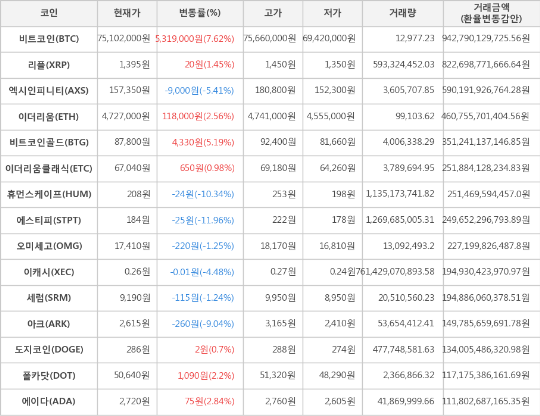 현재 암호화폐 거래소 "업비트"에 따르면 가상화폐 대장 격인 비트코인의 시세는 전일 대비 5,319,000원(7.62%) 상승한 75,102,000원에 거래되고 있다.