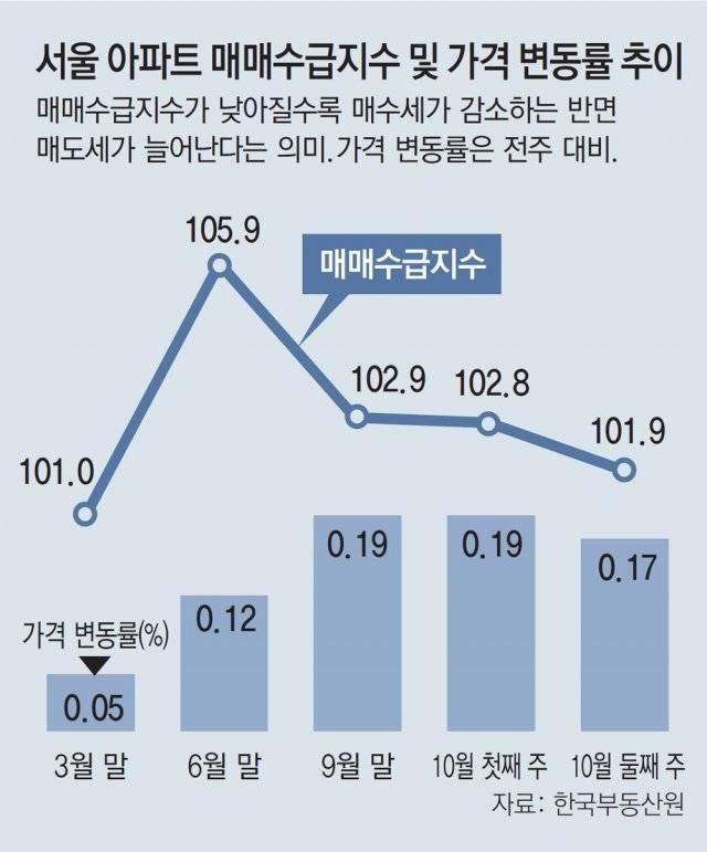 15일 한국부동산원에 따르면 10월 둘째 주(11일 기준) 서울 아파트 매매수급지수는 101.9로 전주 102.8보다 0.9포인트 내렸다. 이 지수는 8월 마지막 주 106.5에서 9월 첫 주 107.2로 상승한 이후 5주 연속 떨어지고 있다. 이 수치가 낮아진다는 건 시장에서 집을 사려는 사람이 줄고 매물은 늘고 있다는 것이다.
