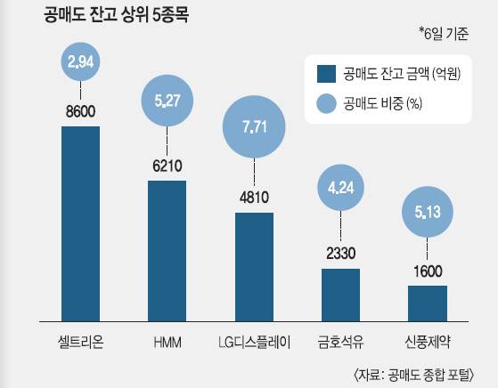 일단 증시가 약세를 띠었던 최근 한 달간(9월 13일~10월 12일) 공매도 잔고 상위 종목(6일 기준)의 주가를 살펴보면 셀트리온이 -19.8%, HMM -24.3%, LG디스플레이 -12.5, 금호석유 -10.7%, 신풍제약 -14.3% 등 낙폭이 큰 편인 건 사실이다. 이들의 공매도 잔고 대량보유자(상장 주식의 0.5% 이상을 공매도 잔고로 보유한 투자자)는 메릴린치인터내셔날, 모간스탠리인터내셔날 피엘씨, 골드만삭스인터내셔널 등 외국계 금융사다.