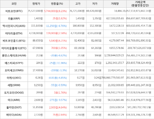 현재 암호화폐 거래소 "업비트"에 따르면 가상화폐 대장 격인 비트코인의 시세는 전일 대비 5,744,000원(8.23%) 상승한 75,527,000원에 거래되고 있다.