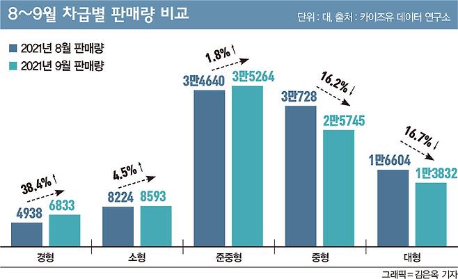 경차 판매량은 가치소비 증가, 차박 인기, 캐스퍼 돌풍 등을 앞세워 상승세다. 카이즈유 데이터 연구소에 따르면 지난 9월 기준 경차 판매량은 6833대로 전월(4938대)보다 38.4%(1895대↑) 늘었다. 같은 기간 소형차는 8593대가 팔려 전월(8224대)보다 4.5%(369대↑), 준중형차는 3만5264대가 판매돼 전월(3만4640대)대비 1.8%(624대↑) 증가하는 데 그쳤다. 인기 차종인 중형, 대형차의 경우는 각각 2만5745대 1만3832대 팔려 전월대비 16.2%(4983대↓), 16.7%(2772대↓) 하락하며 대조를 이뤘다. 세계적으로 계속된 자동차용 반도체 수급 불안 여파에 따라 차 판매량이 전체적으로 급감한것과 비교했을 때 경차의 인기는 압도적이다.