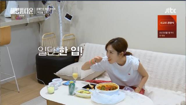 식사를 위해 배달음식을 주문한 윤혜진은 곱도리탕을 받아들었다. 친구 장윤정을 따라 막걸리도 꺼내들었다. '혼술'을 하기로 한 윤혜진은 "내가 마치 진짜 어른이 된 느낌이었다"며 행복한 미소를 지었다.