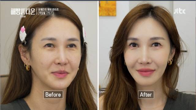 메이크업 아티스트는 "순간 배우 손예진 씨를 닮았다"라 했고 윤혜진은 "그러면 안 된다"라고 손사래 치면서도 만족의 미소를 지었다. '메이크업 주치의'의 팁, 눈 밑 글리터도 얹었다. 윤혜진은 "약간 예쁜척하게 된다"라며 너스레를 떨었다.