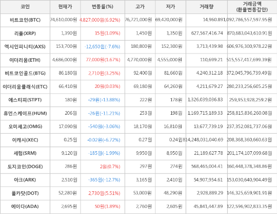 가상화폐 비트코인 4,827,000원 상승한 74,610,000원에 거래
