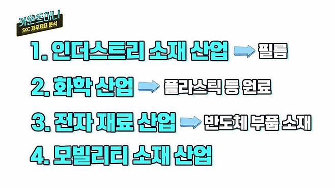 SKC는 인더스트리 소재, 화학, 전자 재료, 모빌리티 소재 사업을 진행하고 있습니다. 인더스트리 소재 사업부에서는 필름을 제작하고요. 화학 사업부는 플라스틱의 원재료, 전자 재료 사업부는 반도체 부품 소재를 각각 맡고 있습니다. 모빌리티 소재 사업부는 지난해 새로 추가된 곳으로 2차 전지에 들어가는 전지박을 만듭니다.