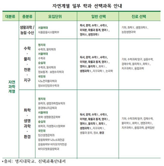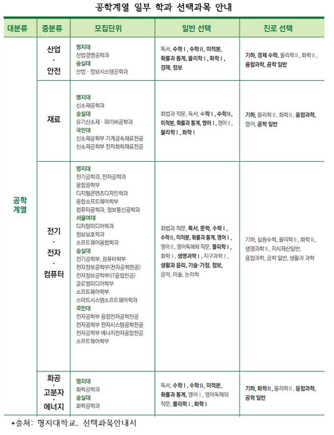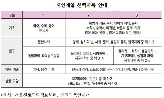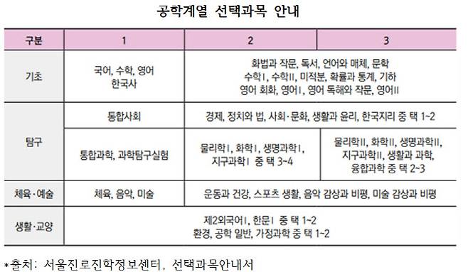 2015 개정교육과정에서는 학생의 진로에 맞는 다양한 교과목을 자유롭게 이수하도록 하고 있다. 이 때문에 과거보다 다양한 교과목을 이수할 수 있게 됐다. 다만 정보가 없어 과목선택에 어려움도 많았다. 이에 각 시도교육청에서는 관련 자료를 개발해 진로진학정보센터의 자료실에 탑재해 놓았다. 아래 표는 서울진로진학정보센터의 선택과목안내서 내용 중 일부이다.