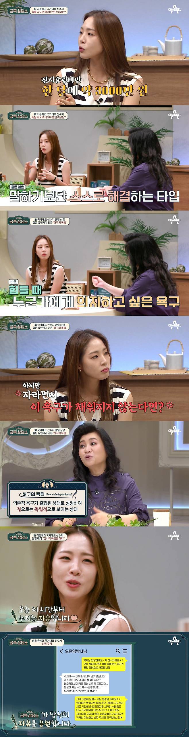 [스포츠조선닷컴 이게은기자] '오은영의 금쪽 상담소' 전 리듬체조 선수 신수지가 선수 시절 힘들었던 에피소드를 전했다.