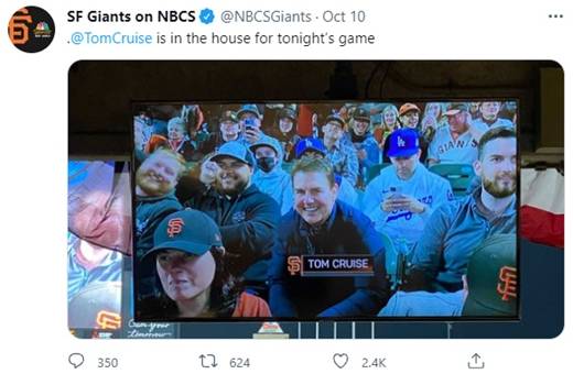 그는 지난 9일(현지시간) 미국 샌프란시스코 오라클 파크에서 열린 샌프란시스코 자이언츠-LA다저스의 내셔널리그 디비전 시리즈(NLDS) 2차전을 관람하던 중 중계 카메라에 포착됐다.