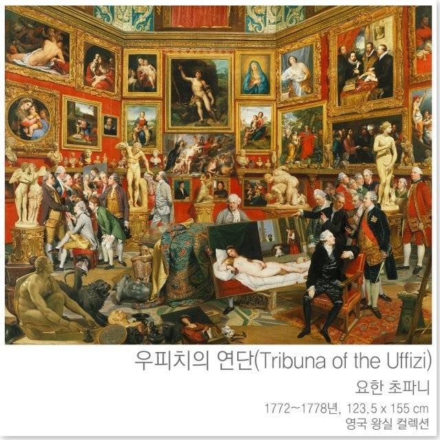 특히 초파니는 자신이 본 우피치 연단의 모습을 그대로 묘사한 것이 아니라, 메디치 컬렉션의 유명 작품들을 적당히 짜깁기해서 이 그림을 그렸다고 하는 것에서도 유추해볼 수 있죠. 그러니 샬롯 왕비는 우피치 연단을 사진 찍듯 재현한 그림을 원한 게 아니라, 유명한 명화가 한 자리에 있는 그림을 원했던 것입니다.