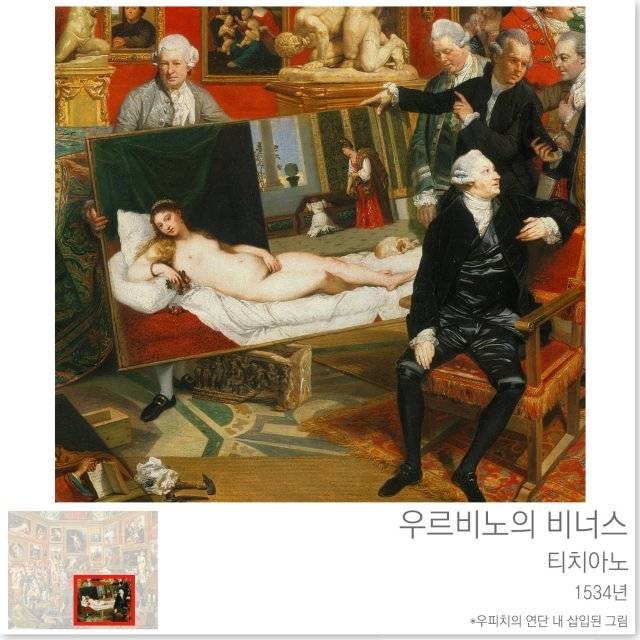 하단에 가장 잘 보이는 그림은 티치아노의 유명한 작품, 우르비노의 비너스입니다. 이탈리아 우르비노의 귀족이 주문한 것으로 그의 결혼을 기념했다는 설, 혹은 당대 유명했던 매춘부인 자페타를 그린 것이라는 이야기가 있습니다.