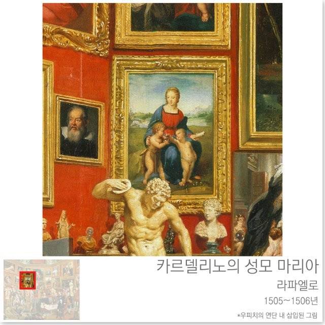 또 전형적인 라파엘로 스타일의 성모자상도 볼 수가 있고요. 이 그림은 라파엘로가 자신의 친구 로렌초 나시에게 선물한 것입니다. 그런데 1548년 나시의 집이 지진으로 무너지고 이 그림도 17조각으로 부서졌다고 하는데요. 이 조각을 당시 곧바로 붙였지만 갈라진 조각을 볼 수 있었고, 2008년 우피치갤러리에서 재 복원 작업을 한 것으로 유명합니다.