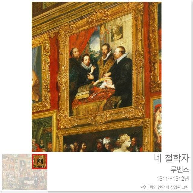 이 그림은 루벤스가 등장합니다. 왼쪽부터 화가 피터 폴 루벤스, 그의 형 필립 루벤스, 철학자 유스투스 립시우스, 왕실의 관리 요아네스 워베리우스의 모습입니다. 그리고 뒤편에는 헬레니즘 양식으로 만들어진 세네카의 조각상이 있습니다. 루벤스는 유명한 화가이자 외교관이었는데요. 당시 유럽 상류층 사이에서 그리스 고전을 공부했던 유행을 보여주고 있습니다.