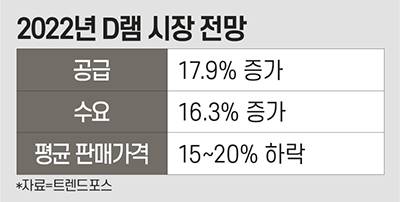 이러한 전망에 정점을 찍은 것이 대만 시장조사업체 트렌드포스가 최근 내놓은 보고서다. 지난 13일 트렌드포스는 보고서를 통해 내년 D램 시장의 평균판매가격(ASP)이 올해보다 15%에서 많게는 20%까지 하락할 것이라고 전망했다. 보고서는 내년 D램 공급 비트그로스(비트 단위 환산 증가율)가 올해 대비 17.9%에 달하지만 수요 비트그로스는 16.3%에 그칠 것으로 분석했다. 주요 D램 고객사들이 올해 초 공급망 차질에 대비하면서 재고 확충에 나선 데다 스마트폰이나 PC 등 주요 메모리 반도체 수요처의 출하량 증가가 제한적일 것이란 이유다.