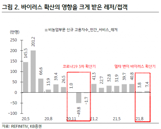 김일혁 KB증권 연구원은 "지난해 말부터 올해 초에 이어 코로나19 팬데믹(사회적 대유행) 영향을 크게 받는 레저 및 접객 부문의 고용이 8~9월에도 늘지 않은 걸 보면 델타 변이 바이러스의 영향을 분명 받았다"며 "아직 델타 변이 영향권에서 벗어난 월간 지표가 나타나지 못하고 있는 점은 아쉽지만 신규 실업수당 청구건수가 20만건대로 진입한 것은 고용시장 불안감이 많이 낮아졌다는 걸 의미한다"고 설명했다.