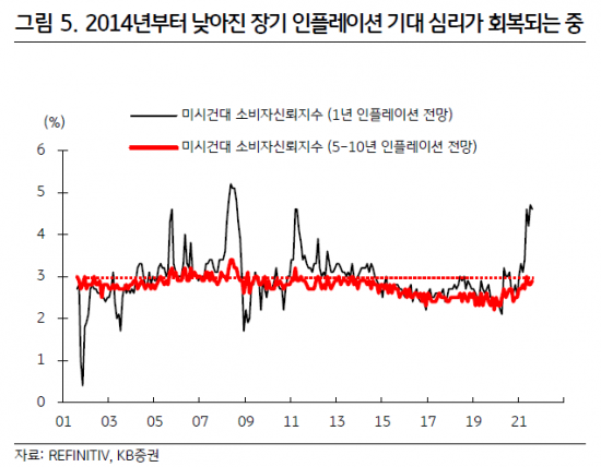 김 연구원은 "장기 기대 인플레이션이 잘 고정돼 있다는 건 ‘공급차질에 의한 인플레이션 상승이 장기 기대 인플레이션을 높이지 못할 것’이라는 찰스 에반스 시카고 연은 총재의 평가와 일치한다"며 "앞으로도 면밀하게 관찰해야 하겠지만, 인플레이션 상승세가 둔화되기 시작하면 장기 기대 인플레이션은 지금처럼 잘 고정돼 있을 전망"이라고 내다봤다.