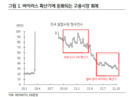 16일 KB증권은 델타 변이로 인한 우려들은 코로나19 재확산이 없다면 내년까지는 문제되지 않을 것으로 내다봤다. 이미 고용시장은 점차 개선되고 있다. 미국 노동부는 지난주(10월 3∼9일) 신규 실업수당 청구 건수가 29만3000건으로 집계됐다고 14일(현지시간) 밝혔다. 전주 대비 3만6000건 가량 줄어든 규모다. 코로나19가 확산되면서 고용시장이 충격을 받은 지난해 3월 둘째주 이후 처음으로 20만건대를 기록한 것이다. 블룸버그통신이 집계한 전문가 전망치 32만건에도 크게 못미치는 수준이다.