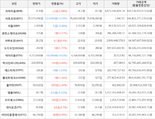 한편 거래금액 기준으로는 리퍼리움, 비트코인, 리플 순으로 가장 활발한 거래를 보이고 있다.