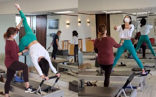 공개된 사진과 영상에는 크롭티와 레깅스를 입은 채 지도자의 도움을 받아 기구 필라테스에 열중한 하원미의 모습이 담겼다.