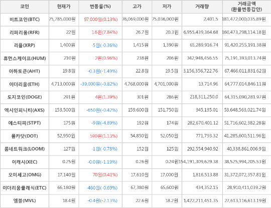 가상화폐 시세 (제공: 암호화폐 거래소 업비트)현재 암호화폐 거래소 "업비트"에 따르면 가상화폐 대장 격인 비트코인의 시세는 전일 대비 97,000원(0.13%) 상승한 75,785,000원에 거래되고 있다.