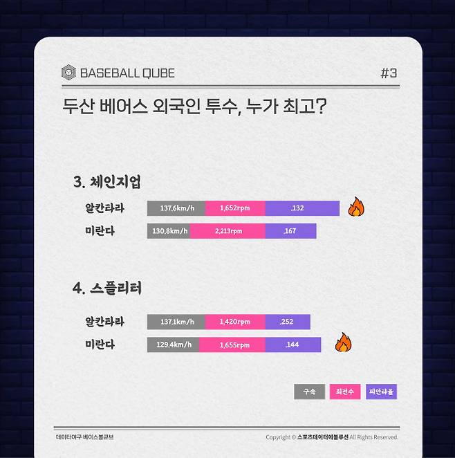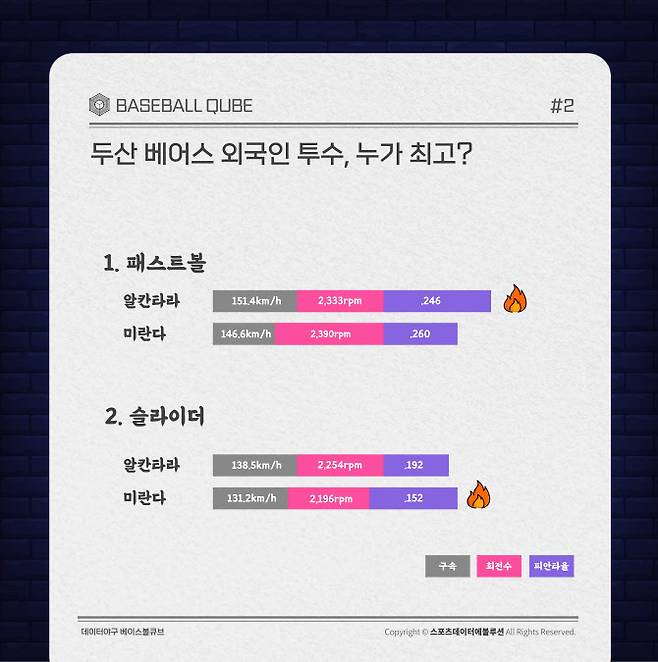 스포츠데이터에볼루션의 제공한 데이터에 따르면 미란다의 구속은 알칸타라에 미치지 못한다.