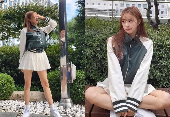 사진 속 미주는 화이트 플레어스커트에 야구 점퍼를 입고 상큼한 매력을 뽐내며 포즈를 취하고 있는 모습.