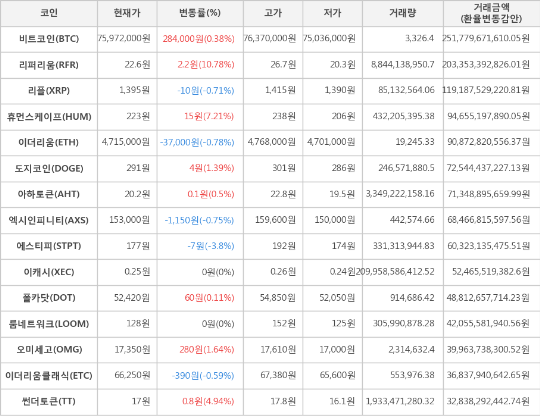 또한, 휴먼스케이프(7.21%, 223원), 썬더토큰(4.94%, 17원), 오미세고(1.64%, 17,350원), 도지코인(1.39%, 291원), 아하토큰(0.5%, 20.2원), 폴카닷(0.11%, 52,420원)이 상승세를 나타냈다.