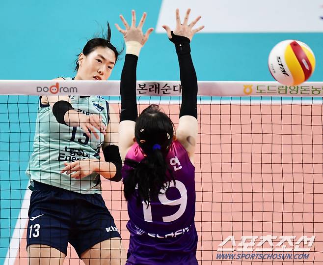16일 서울 장충체육관에서 배구 V리그 여자부 GS칼텍스와 흥국생명의 시즌 개막 경기가 열렸다. GS칼텍스 최은지가 흥국생명 블로킹을 앞에 두고 스파이크를 날리고 있다. 장충=송정헌 기자 songs@sportschosun.com/2021.10.16/