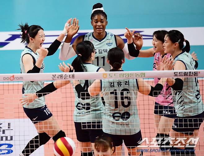 16일 서울 장충체육관에서 배구 V리그 여자부 GS칼텍스와 흥국생명의 시즌 개막 경기가 열렸다. 득점을 올린 GS칼텍스 강소휘가 동료들과 함께 기뻐하고 있다. 장충=송정헌 기자 songs@sportschosun.com/2021.10.16/