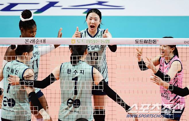16일 서울 장충체육관에서 배구 V리그 여자부 GS칼텍스와 흥국생명의 시즌 개막 경기가 열렸다. 득점을 올린 GS칼텍스 선수들이 기뻐하고 있다. 장충=송정헌 기자 songs@sportschosun.com/2021.10.16/