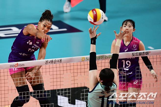 16일 서울 장충체육관에서 배구 V리그 여자부 GS칼텍스와 흥국생명의 시즌 개막 경기가 열렸다. 흥국생명 캣벨이 GS칼텍스 블로킹을 앞에 두고 스파이크를 날리고 있다. 장충=송정헌 기자 songs@sportschosun.com/2021.10.16/
