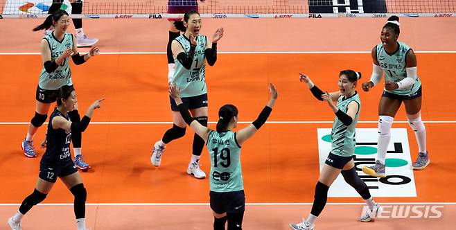 [서울=뉴시스] 추상철 기자 = 16일 오후 서울 중구 장충체육관에서 열린 '2021-2022 V-리그 여자부' 개막전 GS칼텍스와 흥국생명의 경기. GS칼텍스 선수들이 득점 후 기뻐하고 있다. 2021.10.16. scchoo@newsis.com