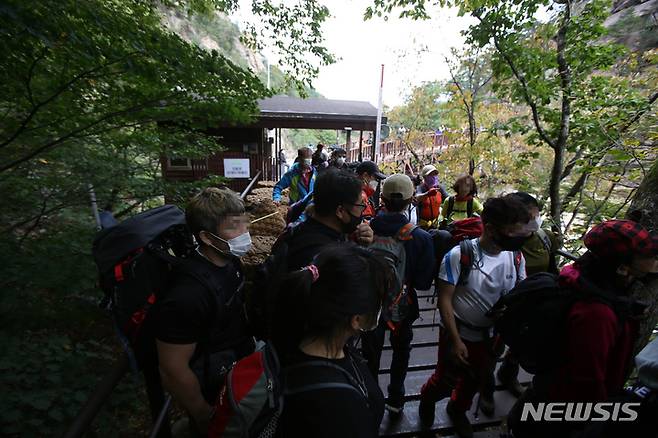 [속초=뉴시스] 김경목 기자 = 10월의 세 번째 주말 첫날인 16일 오후 등산객들이 강원도 속초시 설악산 국립공원 천불동 계곡 쪽으로 향하고 있다. 국립공원공단에 따르면 산행 시에도 거리두기 2m를 유지해야 한다. 2021.10.16. photo31@newsis.com