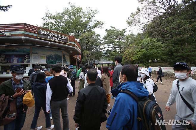 [속초=뉴시스] 김경목 기자 = 대체로 맑은 날씨를 보인 10월의 세 번째 주말 첫날인 16일 오전 강원도 속초시 설악산 국립공원 설악산 매표소 앞이 입장권을 구입하려는 인파들로 북새통을 이루고 있다. 사회적 거리두기는 지켜지고 있지 않았다. 매표소는 대한불교 조계종 신흥사에서 운영하고 있다. 2021.10.16. photo31@newsis.com