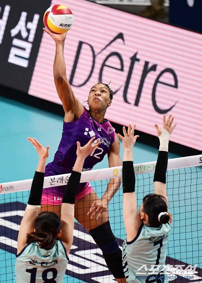 16일 서울 장충체육관에서 배구 V리그 여자부 GS칼텍스와 흥국생명의 시즌 개막 경기가 열렸다. 흥국생명 캣벨이 GS칼텍스 블로킹을 앞에 두고 스파이크를 날리고 있다. 장충=송정헌 기자 songs@sportschosun.com/2021.10.16/