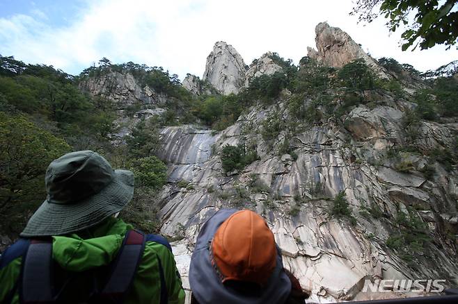 대체로 맑은 날씨를 보인 10월의 세 번째 주말 첫날인 16일 오후 등산객들이 강원도 속초시 설악산 국립공원에서 비선대를 바라보며 감탄하고 있다.