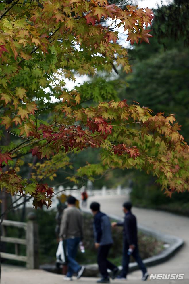 [속초=뉴시스] 김경목 기자 = 대체로 맑은 날씨를 보인 10월의 세 번째 주말 첫날인 16일 오전 강원도 속초시 설악산 국립공원 소공원 단풍나무의 잎이 붉게 물들어가는 모습에서 깊어가는 가을의 정취가 느껴진다. 2021.10.16. photo31@newsis.com