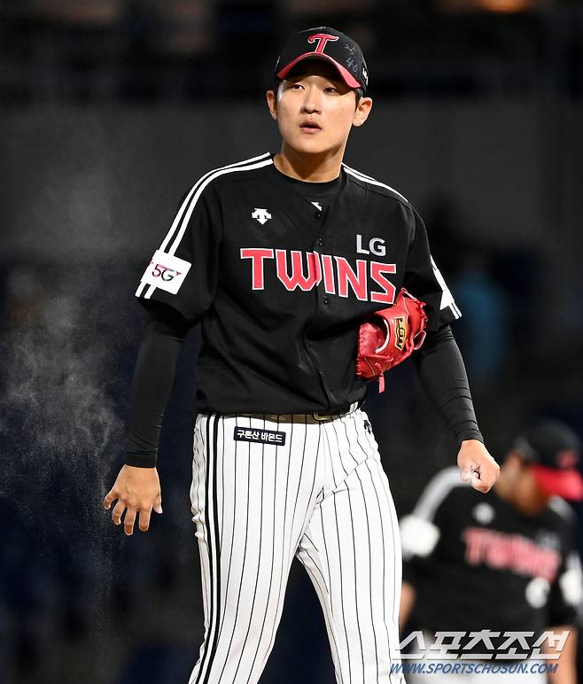 2021 KBO리그 LG 트윈스와 NC 다이노스의 경기가 16일 창원NC파크에서 열렸다. 4회말 무사 1루 NC 양의지를 병살로 막아낸 LG 임준형이 로진백을 만지고 있다. 창원=허상욱 기자 wook@sportschosun.com/2021.10.16/