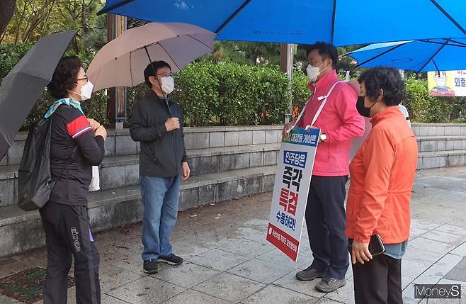 [머니S포토] 지역구 찾아 '대장동 의혹 즉각 특검 수용' 피켓 두른 정동만 의원