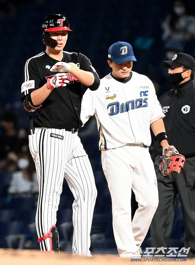 2021 KBO리그 LG 트윈스와 NC 다이노스의 경기가 16일 창원NC파크에서 열렸다. 5회초 LG 홍창기가 안타를 치고 기쁨을 나누고 있다. 창원=허상욱 기자 wook@sportschosun.com/2021.10.16/