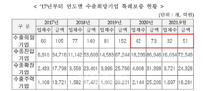 신보에서는 수출을 희망 또는 준비중인 기업에게 수출희망기업 특례보증을 지원하고 있다. 최근 5년간 수출희망기업 특례보증 실적은 총 521억원(292개 업체)으로 집계됐다. 연도별로 보면 2017년 105억원(60개 업체), 2018년 140억원(77개 업체), 2019년 152억원(81개 업체), 2020년 73억원(42개 업체), 올 9월까지 51억원(32개업체)이다.