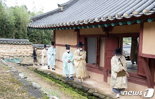 (구미=뉴스1) 정우용 기자 = 16일 열린 구미시 해평면 낙성리 김숙자(金叔滋)·김취성(金就成)·박운(朴雲)·김취문(金就文)· 고응척(高應陟) 등 5현의 위패가 봉안된 낙봉서원 추계향사에서 장세용 시장등 헌관들이 사당을 둘러보고 있다. 2021.10.16/뉴스1