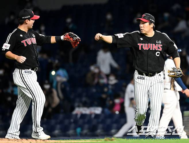 2021 KBO리그 LG 트윈스와 NC 다이노스의 경기가 16일 창원NC파크에서 열렸다. 5회말 수비를 마친 LG 김현수가 김민성과 기쁨을 나누고 있다. 창원=허상욱 기자 wook@sportschosun.com/2021.10.16/