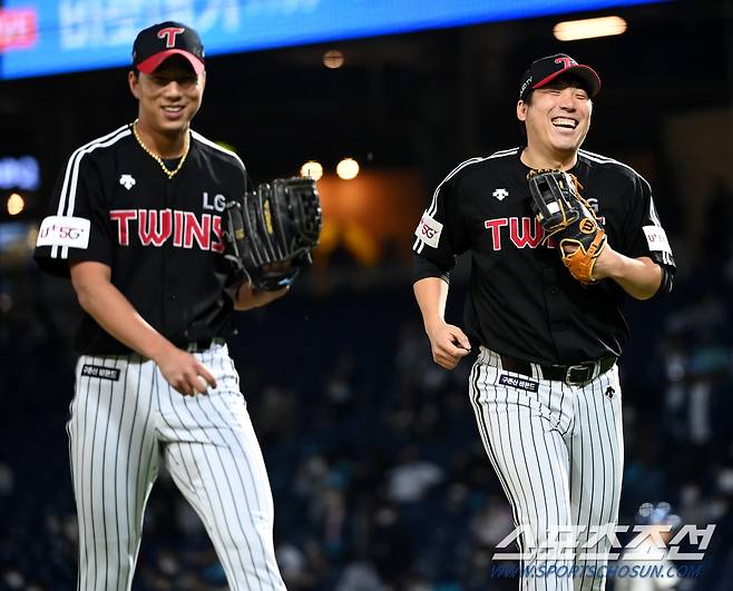 2021 KBO리그 LG 트윈스와 NC 다이노스의 경기가 16일 창원NC파크에서 열렸다. 6회말 수비를 무실점으로 마친 LG 김현수와 정우영이 더그아웃으로 향하고 있다. 창원=허상욱 기자 wook@sportschosun.com/2021.10.16/