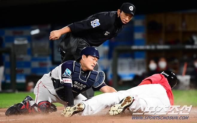 2021 KBO리그 롯데 자이언츠와 SSG랜더스의 16일 부산사직야구장에서 열렸다. SSG 한유섬이 8회초 1사 2루에서 오태곤 우전안타때 홈에서 아웃되고 있다. 롯데 포수는 안중열. 부산=최문영 기자 deer@sportschosun.com /2021.10.16/