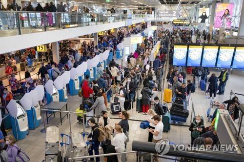 epa09526668 Bustle at Schiphol airport due to the autumn holidays, Netherlands, 16 October 2021. The airport expects to process 2 million travelers. Cities such as Istanbul, London and Barcelona are popular destinations. EPA/Evert Elzinga