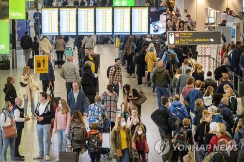 epa09526669 Bustle at Schiphol airport due to the autumn holidays, Netherlands, 16 October 2021. The airport expects to process 2 million travelers. Cities such as Istanbul, London and Barcelona are popular destinations. EPA/Evert Elzinga