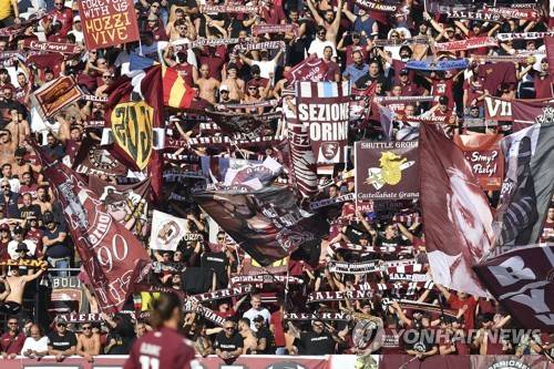 Salernitana supporters cheer during the Serie A soccer match between Spezia and Salernitana, at the Armando Picco stadium in La Spezia, Italy, Saturday, Oct. 16, 2021. (Tano Pecoraro/LaPresse via AP) ITALY OUT;